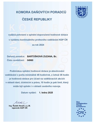 Dnes som absolvovala konzultáciu s pani Zuzanou Bartůškovou na téma, ktoré v beženej účtovnej a daňovej praxi nestretnete práve každý deň. Táto konzultácia bola pre mňa veľkým prínosom, a to predovšetkým preto, že som dostala konkrétne odpovede na moje otázky, vrátane uvedenia zdroja, z ktorého pri posúdení mojho problému vychádza. Samozrejme okamžite po ukončení hovoru moj mozog začal generovať množstvo otázok a kombinácii, z ktorých časť by bola vhodným námetom pre ďalšiu konzultáciu, preto pevne verím, že pani Bartůškovú príliš nevydesím konštatovaním, že jej daňové poradenstvo rada využijem i v budúcnosti.