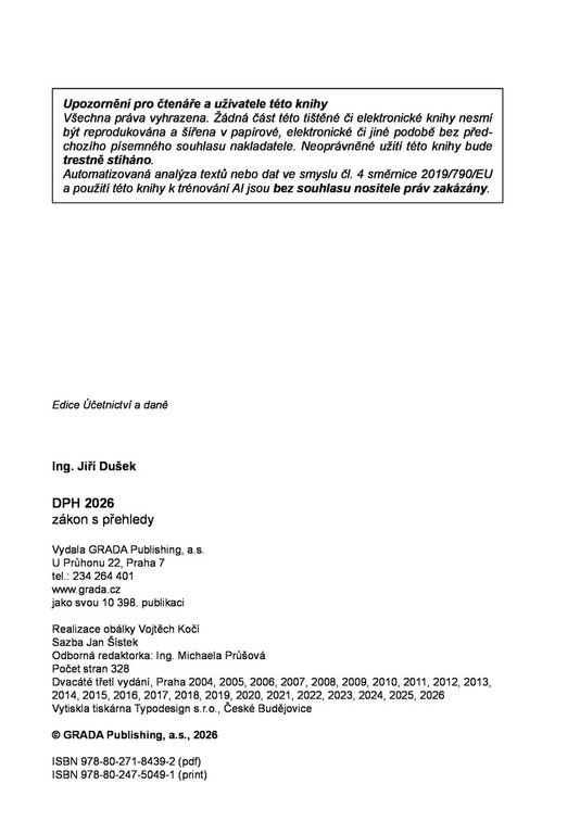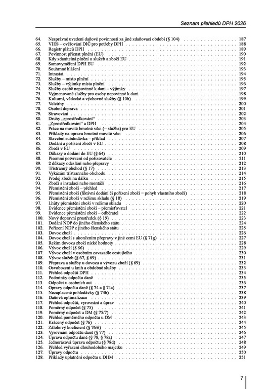 V 23. vydání praktické, osvědčené publikace autor na 193 přehledech názorně „zobrazuje“ zákon o DPH ve znění platném k 1. 1. 2026. Tyto přehledy jsou vždy doplněny paragrafy zákona, čímž získáváte neocenitelného pomocníka. Názorné přehledy obsahují např. nová pravidla vrácení daně, podmínky pro vývoz zboží v osobním zavazadle cestujícího, povinnost vrátit odpočet u pohledávek neuhrazených do 6 měsíců po splatnosti, změnu místa plnění u online akcí, režim pro malé podniky, kompletní přehledy druhů a úprav odpočtů, řetězové obchody, podmínky ručení za nezaplacenou daň, podmínky DPH u cestovních služeb, zjednodušený režim „call-offstock“, kdy a jak použít zálohový koeficient, opravy DPH, přenesení daňové povinnosti v tuzemsku, zdanění služeb v EU, poskytnutí služeb z EU a třetích zemí, změny režimu při registraci, vrácení DPH při zrušení registrace a další. V příloze jsou uvedeny formuláře k DPH a seznam elektronicky poskytovaných služeb.