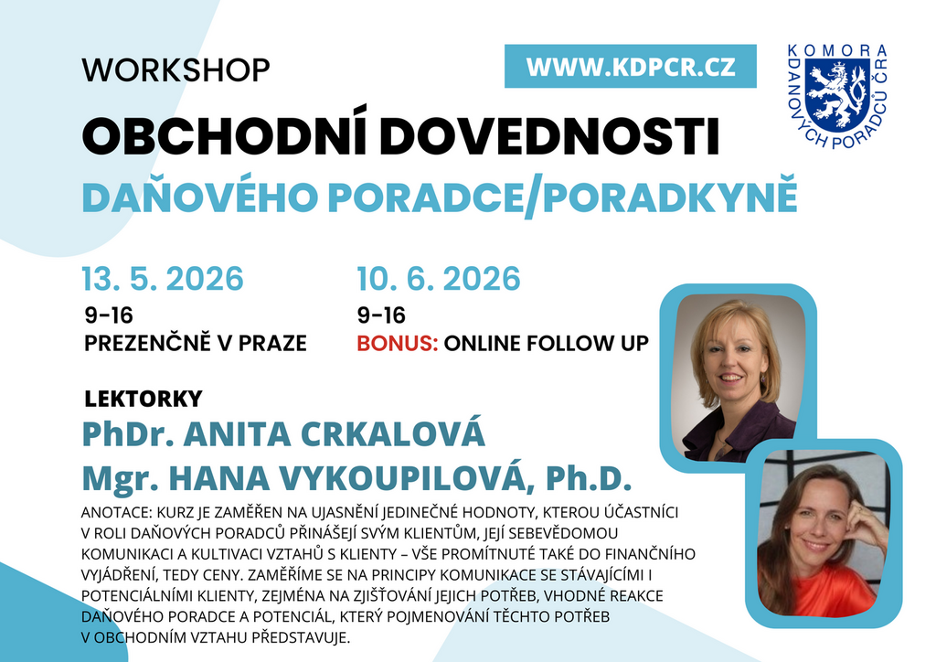 Komora daňových poradců ČR připravila interaktivní workshop zaměřený na rozvoj obchodních dovedností v poradenské praxi. Kurz reaguje na potřebu sebevědomě komunikovat vlastní přidanou hodnotu, kultivovat vztahy s klienty a promítnout kvalitu služby také do její cenotvorby.