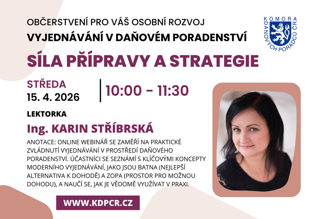 Důraz bude kladen na schopnost stanovit si cíle, minima a nepřekročitelné hranice, ale také na práci se směnnými proměnnými, které umožňují vytvářet dlouhodobě udržitelná „win-win“ řešení. Součástí webináře bude i téma volby vhodné vyjednávací strategie, práce s otázkami, očekáváními klienta a neverbálními aspekty vyjednávání – tónem hlasu, tichem či strukturou rozhovoru. Vše bude ilustrováno na konkrétních příkladech z praxe daňových poradců.